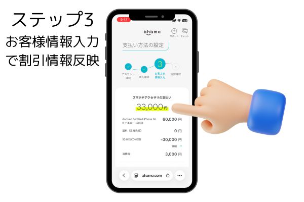 その後、dアカウントでのログイン➡ahamoアプリを使用した本人確認➡ステップ3まで進めば割引適用後の価格が表示されます。